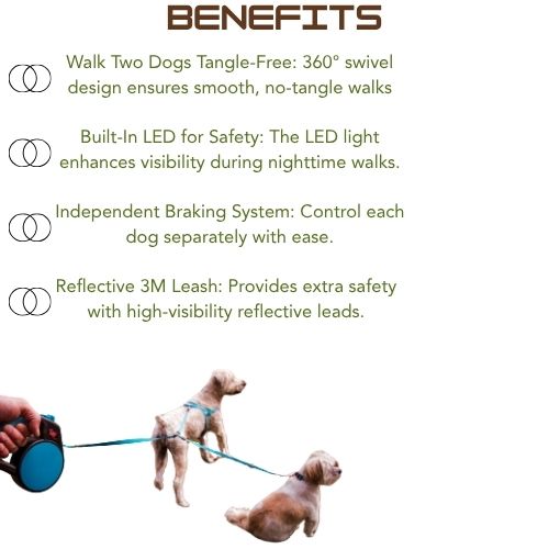 Our leash transforms your daily walks by eliminating tangles, enhancing safety, and providing ultimate control. Experience the freedom and joy of walking your dogs with ease and confidence.